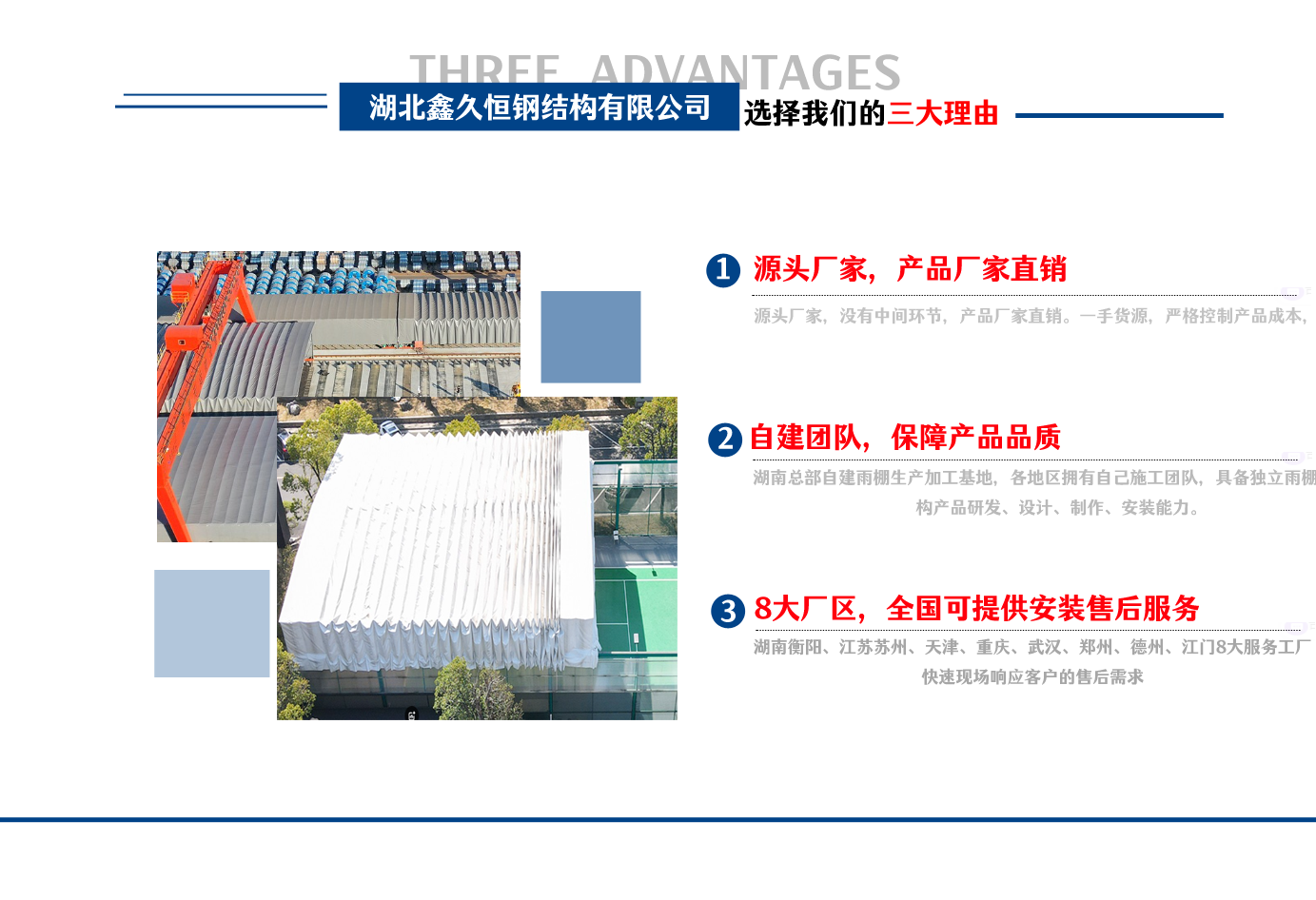 湖北鑫久恒鋼結(jié)構(gòu)有限公司是一家電動(dòng)雨棚、膜結(jié)構(gòu)車棚研發(fā),生產(chǎn)銷售,施工安裝于一體的專業(yè)鋼結(jié)構(gòu)科技公司,主要產(chǎn)品有伸縮雨棚,電動(dòng)雨棚,膜結(jié)構(gòu)車棚等。 湖南地區(qū)職員目前有80多人,占地面積20000平方米,廠房面積15600平方米,配備先進(jìn)的生產(chǎn)流水線,使每件品質(zhì)產(chǎn)品的堅(jiān)實(shí)基礎(chǔ)。 公司在蘇州、天津、重慶、武漢、德州、烏魯木齊、江門均設(shè)有服務(wù)工廠,總?cè)藛T共300多人,擁有專業(yè)的技術(shù)團(tuán)隊(duì),配備先進(jìn)的設(shè)備和流水線生產(chǎn),產(chǎn)能高,貨源充足,發(fā)貨速度快,服務(wù)區(qū)域廣。 移動(dòng)伸縮棚適用于通道臨時(shí)倉儲(chǔ)、戶外運(yùn)動(dòng)遮陽、污水池遮蓋、能源交通、熱力化工、礦山、船舶制造及市政建設(shè)、物流、碼頭等領(lǐng)域的構(gòu)件制作加工,成品半成品存放、倉庫、野外儀器設(shè)備操作用房等。尤其是對(duì)工廠發(fā)貨、倉儲(chǔ)臨時(shí)遮雨防嗮,梅雨期較長、建設(shè)周期較短的工程施工等特別適用。還可根據(jù)用戶需求量身定制、適合企業(yè)所需不同款式的產(chǎn)品。 我公司堅(jiān)持“誠信社會(huì)為本,客戶滿意為榮”的經(jīng)營理念,做到質(zhì)量把控,嚴(yán)格管理,精益求精,恪守承諾。使鑫久恒逐步走向成熟,其系統(tǒng)化、專業(yè)化日趨完善。以專業(yè)的技術(shù)、科學(xué)的管理,更高的產(chǎn)品質(zhì)量,優(yōu)良的企業(yè)信譽(yù),真誠的客戶服務(wù),靈活多樣的經(jīng)營方式和務(wù)實(shí)創(chuàng)新的企業(yè)精神愿與社會(huì)各界攜手合作,為推動(dòng)智能鋼結(jié)構(gòu)建筑事業(yè)的發(fā)展而不斷努力。...